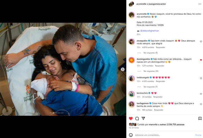 Nasceu, neste domingo (7), Joaquim, o segundo filho do cantor João Gomes e da influenciadora Ary Mirelle. Nas redes sociais, o casal, que já é pai de Jorge, de 1 ano, anunciou a chegada do novo integrante da família. Os dois estão juntos desde 2022 e se casaram em outubro de 2024, no Recife.